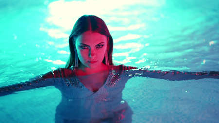 Beautiful woman posing in pool water under neon color light. Party, attractive chic in shining dress enjoying night time. Rich lifestyle, luxury life, influential people