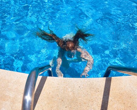 Cute adorable girl floating on back in water pool on backyard. Kid child enjoying having fun in swimming pool. Summer outdoor water activity for kids. View from above overhead.
