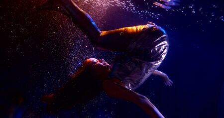 woman is somersaulting underwater in swimming pool or aquarium in darkness