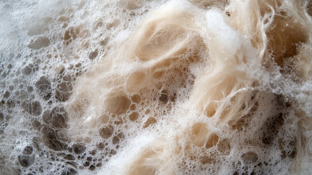 A detailed close-up shot of foamy water, showcasing a dynamic interplay of white bubbles and rich brown and white textured elements, creating an abstract and organic visual.