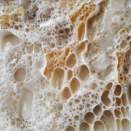 Sourdough Starter Texture. Close-up of a bubbly, porous sourdough starter with intricate gluten strands and gas pockets formed during fermentation.