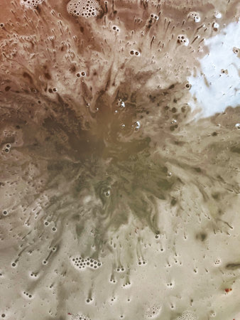 Close up of frothy coffee foam creating abstract shapes with visible bubbles, perfect for backgrounds or textures