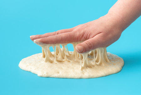 Close-up with a woman's hand testing the sourdough starter, minimalist on a blue table.