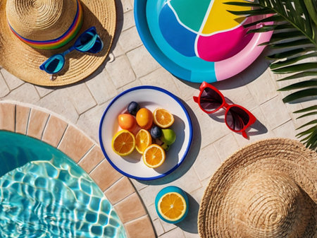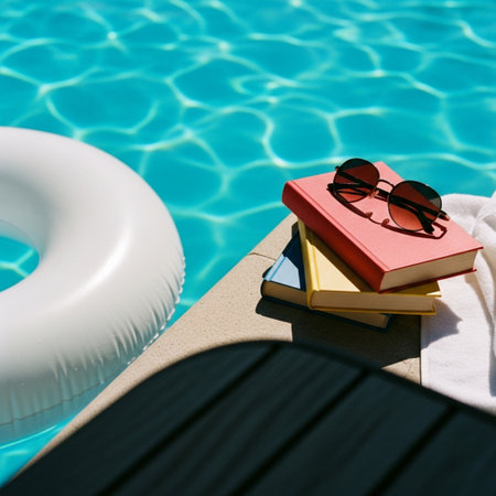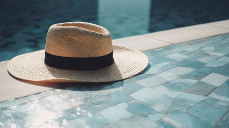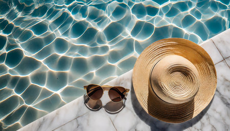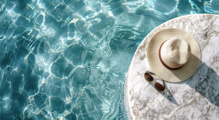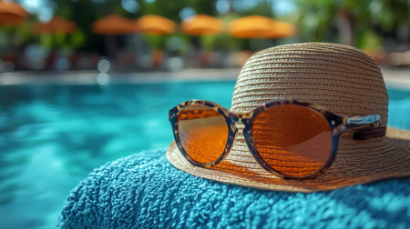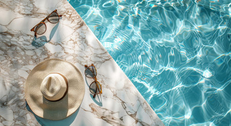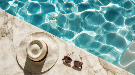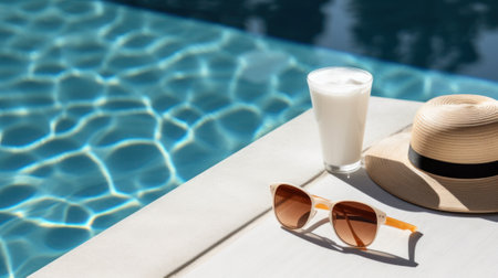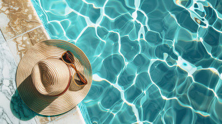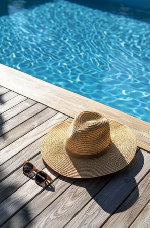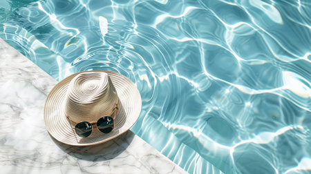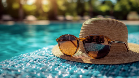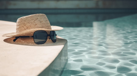 Straw hat and sunglasses resting on the pool's edge, reflecting summer and relaxation
