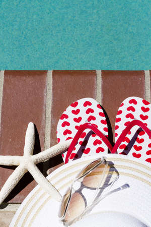 Swimming pool shoes thongs flip flops towel and shell starfish