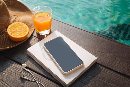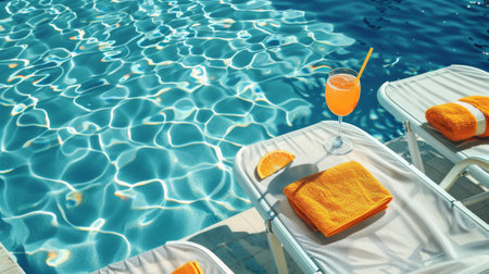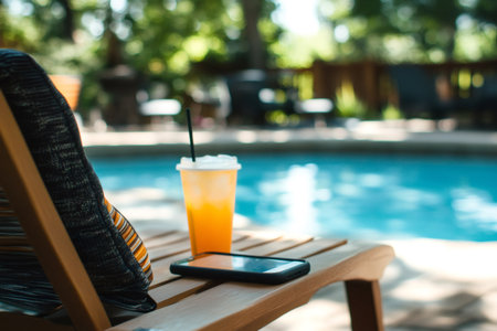 Refreshing orange juice and smartphone placed on a wooden deckchair by a tranquil blue pool, creating a perfect summer relaxation scene