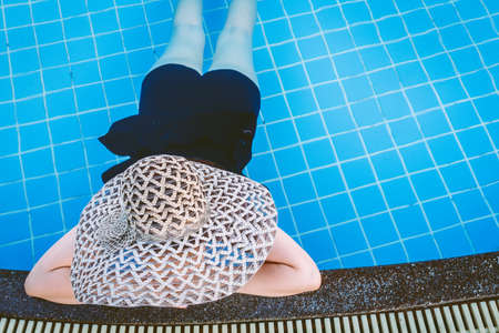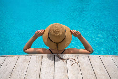 Unrecognizable woman in big hat enjoying relaxing on the swimming pool at luxury villa, travel near the sea and beach in the sunset.