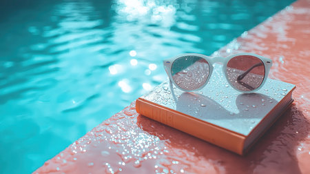 White sunglasses rest on a book by a pool, water droplets glistening in the sunlight, creating a refreshing and relaxing summer scene.