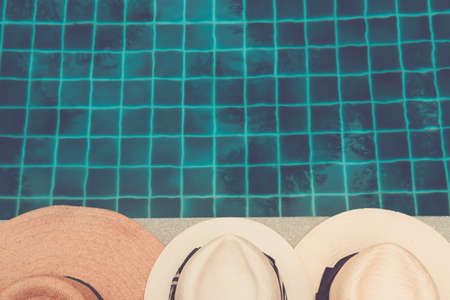 A vintage straw hat with sunglasses at the border of a swimming pool in summer