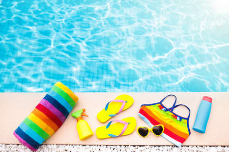 Swimming pool accessories flat lay. Top view of beach items on pool deck. Flip flops, bikini and hat, sun glasses. Water toys. Summer vacation in tropical resort. Copy space. Colorful beach wear.