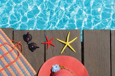 Summer beach set on swimming pool water background