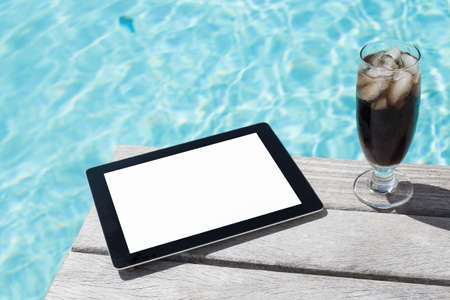 Tablet computer and refreshing drink by the swimming pool