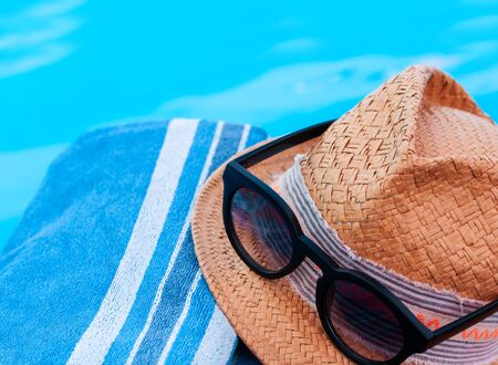 Vintage summer wicker straw beach hat, sun glasses, blue towel near swimming pool, tropical background
