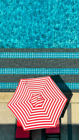 Vibrant red and white striped umbrella by shimmering turquoise pool captures essence of relaxation at resort, offering picturesque scene for vacation and leisure time. Vertical format, copy space