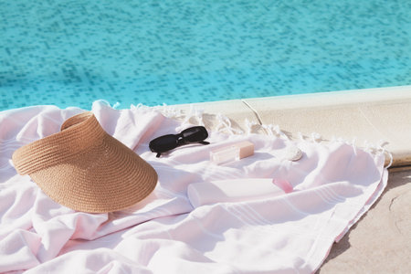 Stylish sunglasses, visor cap on blue towel near outdoor swimming pool, closeup