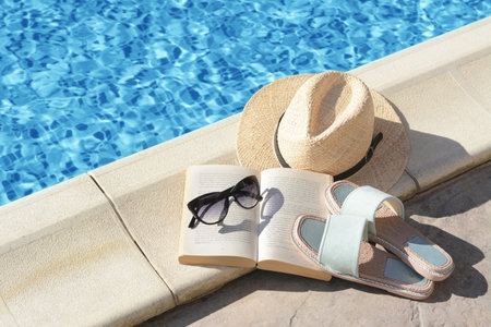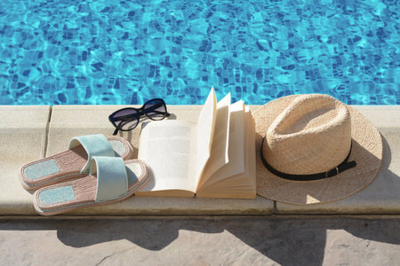 Stylish sunglasses, slippers, straw hat and book at poolside on sunny day. beach accessories