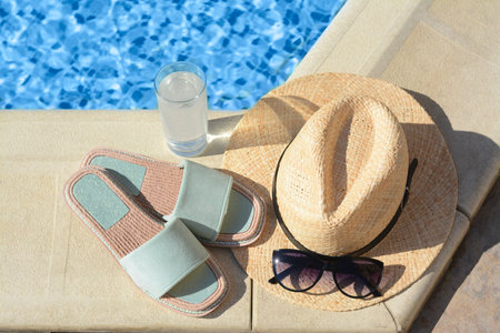 Stylish sunglasses, slippers, straw hat and glass of water at poolside on sunny day. beach accessories