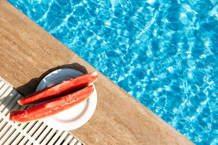 Summer background with fresh water melon near swimming pool. Hot summer travel, vacation and holiday concept. Top view. Copy space