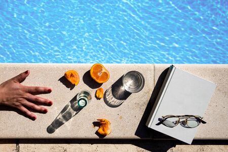 white book with glasses and fruits next to the pool