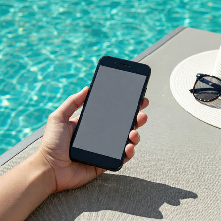 Woman holding smartphone with blank screen, relaxing by the pool. Summer vacation lifestyle, mobile technology, poolside, sun, sunglasses, and hat included in the scene.