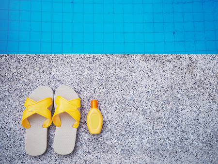 Yellow sandal and sunscreen lotion by swimming pool. Summer holiday background concept.