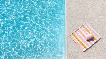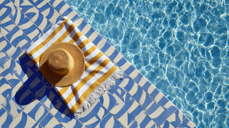 A sun hat and striped towel rest by a sparkling blue swimming pool, capturing the essence of a perfect summer day for relaxation and enjoyment.