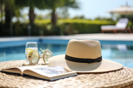 Poolside Serenity: A Stylish Blend of Beige Straw Hat, Book, Sunglasses, and Refreshing Drink