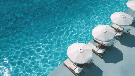 Elegant umbrellas and chairs around a stunning hotel pool, epitomizing a luxurious holiday vacation.