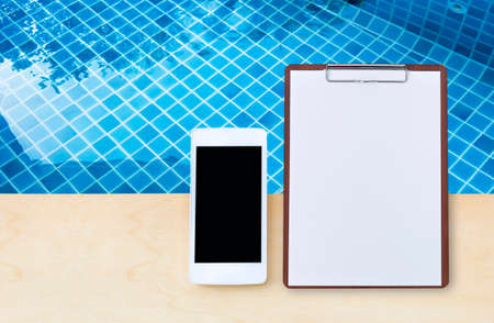 Smartphone with blank paper sheet on wooden clipboard over clean swimming pool water, pool maintenance and service check list