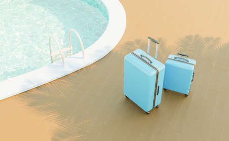 two blue suitcases next to the edge of a swimming pool with its stairs and a palm tree shadow. 3d render