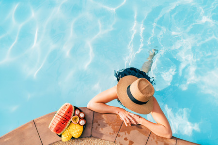 Woman relaxing at swimming pool, summer vacation concept