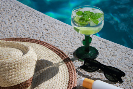 refreshing mojito cocktail at the pool with sunscreen, sunglasses and straw hat