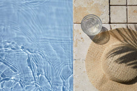 Poolside still life. Straw hat on floor next to resort swimming pool. Glittering crystal clear blue water in sunlight. Summer holiday composition. Swimming, relaxation and travel concept.