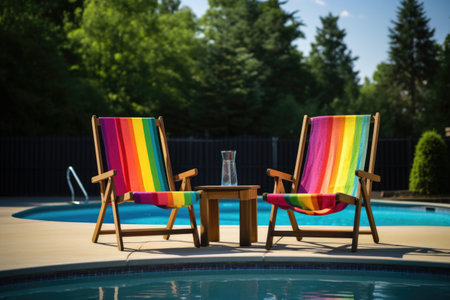 image of two rainbow deck chairs standing next to a pool, created with generative ai