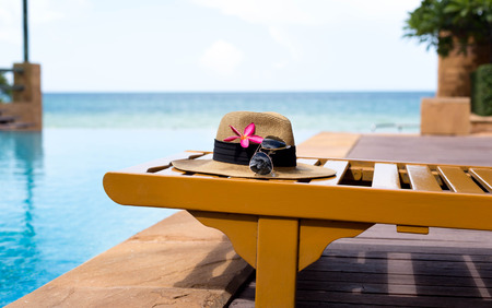 Sunglass and Hat on luxury swimming pool tropical beach resort , summer concept