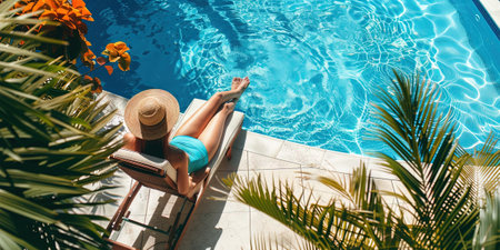 Enjoy a serene summer scene featuring a straw hat, a book, and a towel by a sparkling turquoise pool. Perfect ambiance for relaxation and leisure.