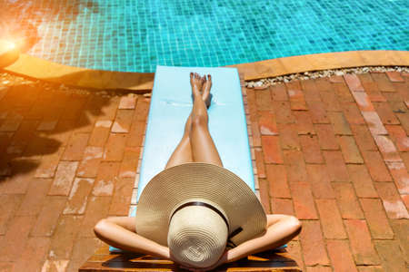 Woman wear big hat laying on wood bed beside swimming pool with blue water. Concept for relaxing and hapiness luxury lifestyle of modern people.