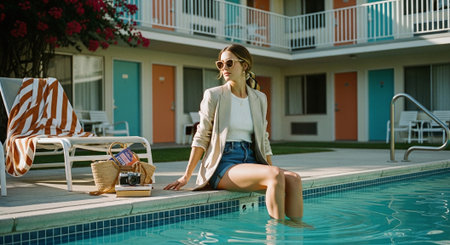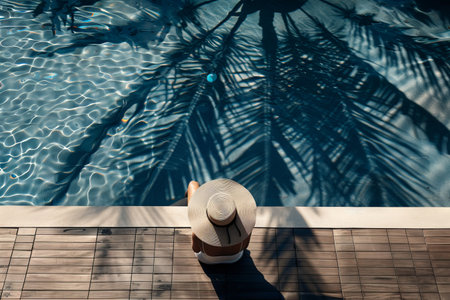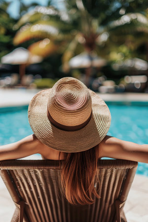 Enjoying summer vibes with a straw hat and sunglasses by the poolside, perfect for a relaxing vacation