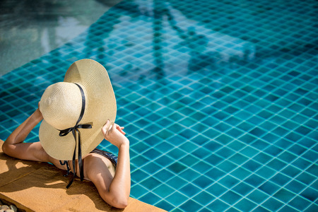 Woman spends time and has relax on the pool. People, summer and holiday concept