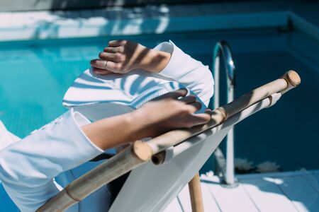 Young woman lying by the pool on sunbed at ot summer day