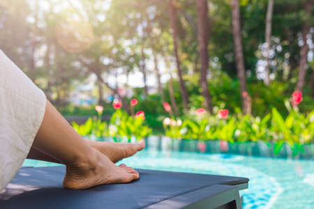 Beautiful woman legs sunbathe near swimming pool on vacation.