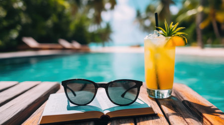 Enjoy a serene moment by the pool with sunglasses and a refreshing drink, perfect for summer escapes and relaxation in a beautiful tropical setting.
