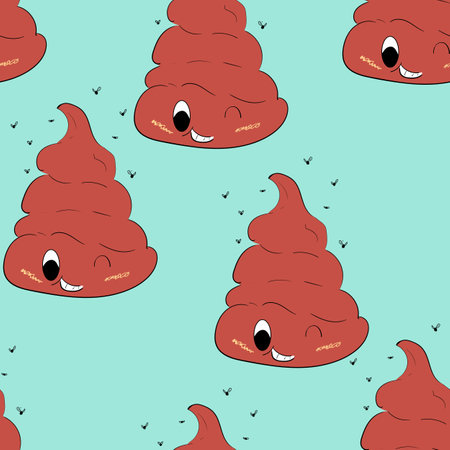 Seamless pattern with kawaii poop on color background. Cartoon poo, feces icons. Shit patterns, evil turd. Vector illustration for invitation, poster, card, fabric, textile. Doodle style