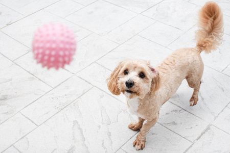 The dog is playing with a pink ball. Dog in a motion. Playful dog. Dog care concept. High-quality photo