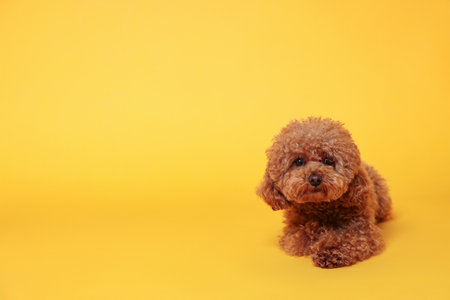 Cute Maltipoo dog on orange background, space for text. Lovely pet