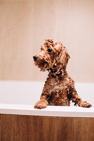 The process of washing a dog at home. A small red poodle is being washed in the bathroom. Wet dog in the bathroom