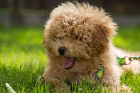 Tired brown poodle dog with grass straw on his mouth resting after exercise at park
