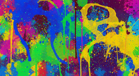 Cinematic texture featuring playful paint splatters in vibrant colors and patterns