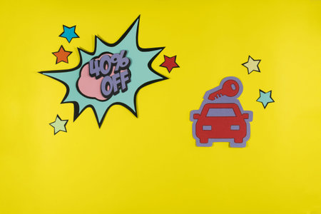 Buying and selling cars, with discount text in comic style, pop art, on yellow background.