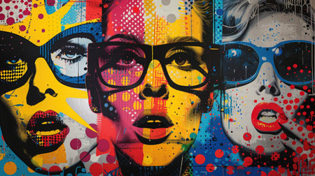 Vibrant street art featuring a bold, colorful portrait of a woman with sunglasses, set against a bright mural backdrop.